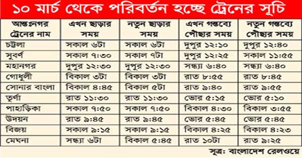 ১ বছর ৩ মাস পর ট্রেন চলাচলের সূচিতে ফের পরিবর্তন আনতে যাচ্ছে বাংলাদেশ রেলওয়ে কর্তৃপক্ষ। নতুন সূচিতে রেলওয়ে পূর্বাঞ্চলের অধীনে চলা ১৫টি ট্রেন ছাড়ার সময় এবং ৩৫টি ট্রেনের গন্তব্যে পৌঁছার সময়ে পরিবর্তন আনা হয়েছে। এরমধ্যে চট্টগ্রাম রেলওয়ে স্টেশন থেকে ছেড়ে যাওয়া ৩টি ট্রেন ছাড়ার সময় এবং ৮টি ট্রেনের গন্তব্যে পৌঁছার সময়ে পরিবর্তন এসেছে। আগামী সোমবার থেকে নতুন সূচিতে চলবে এসব ট্রেন।