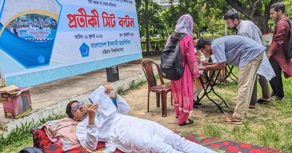 চট্টগ্রাম বিশ্ববিদ্যালয় (চবি) ২০২৪-২৫ শিক্ষাবর্ষের নবীন শিক্ষার্থীদের প্রশাসন কর্তৃক সিট বরাদ্দ না দেওয়ার প্রতিবাদে প্রতীকী সিট বণ্টন কর্মসূচি পালন করছে বিশ্ববিদ্যালয় শাখা ছাত্রশিবিরের নেতাকর্মীরা।