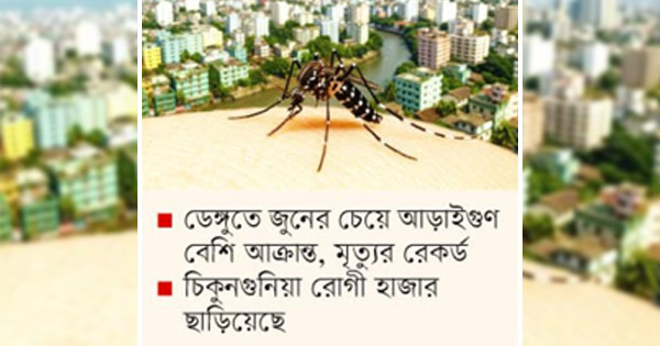 পরিসংখ্যান অনুযায়ী, জুনে যেখানে ডেঙ্গু আক্রান্ত হয়েছিলেন ১৭৬ জন, সেখানে জুলাইয়ে তা বেড়ে দাঁড়িয়েছে ৪৩০ জনে। মৃত্যু যেখানে জুনে ছিল ‘শূন্য’, সেখানে জুলাই মাসেই মৃত্যু ৭ জনের। অগাস্টে পরিস্থিতি আরও খারাপ হওয়ার শঙ্কা করছেন চিকিৎসকরা।