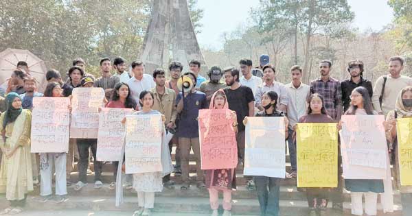 রবিবার (১৬ ফেব্রুয়ারি) দুপুরে বিশ্ববিদ্যালয়ের সাধারণ শিক্ষার্থীদের ব্যানারে হওয়া এই মানববন্ধনে ক্যাম্পাসের বিভিন্ন প্রগতিশীল ছাত্র সংগঠনের প্রতিনিধিরা অংশ নেন।