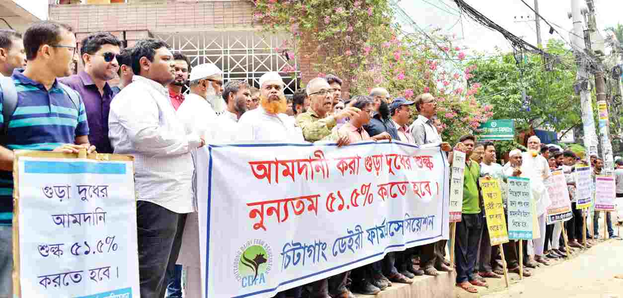 আমদানি করা গুঁড়া দুধের শুল্ক নূন্যতম ৫১.৫ শতাংশ করার দাবিতে মানববন্ধন করেছে চিটাগাং ডেইরি ফার্ম এসোসিয়েশন। গতকাল মঙ্গলবার সকালে চট্টগ্রাম প্রেসক্লাবের সামনে এ মানববন্ধন অনুষ্ঠিত হয়। মানববন্ধনে বক্তারা আমদানি করা গুঁড়া দুধের শুল্ক ৫১.৫ শতাংশ করার দাবি করে বলেন, ১২ বছর আগে যেখানে ২৫ শতাংশ দুধের সরবরাহ ডেইরি থেকে পেত, এখন সেটা ৭০ শতাংশের উপরে। তরুণ শিক্ষিত যুবকেরা ডেইরিতে এগিয়ে আসার কারণে এটা সম্ভব হয়েছে। মানববন্ধনে চিটাগাং ডেইরি ফার্ম এসোসিয়েশনের সাধারণ সম্পাদক নাঈম উদ্দিন বলেন, আজ থেকে মাত্র নয় বছর আগে আমাদের দেশে গুঁড়া দুধের আমদানি শুল্ক ছিল ৫১.৫ শতাংশ। কিন্তু বর্তমান সময়ে এসে তা মাত্র ২৫ শতাংশে এসে দাঁড়িয়েছে। কিন্তু দুঃখের বিষয় হচ্ছে, মিল্কভিটা, আড়ং প্রাণসহ অনেক কোম্পানি বলে থাকে তারা গাভী থেকে দুধ সংগ্রহ করে বিক্রি করে। কিন্তু বাস্তবে তারা আমদানি করা গুঁড়া দুধকে তরল দুধ বানিয়ে বিক্রি করে মানুষের সাথে প্রতারণা করছে। তিনি আরো বলেন, দেশে খাদ্য উৎপাদনে বাংলাদেশ এখন প্রায় সয়ংসম্পূর্ণ। আমরা বর্তমানে চাউল রপ্তানি করার চিন্তা করি। বর্তমানে আমাদের দেশের প্রায় ৩৬ ভাগ শিশু অপুষ্টিতে ভোগে। এছাড়া, আমাদের দেশের প্রচুর নারী অপুষ্টিতে ভোগে। এর কারণ হচ্ছে আমাদের দেশের দুধের ব্যবহার এবং প্রাপ্যতা কম। এদেশের মানুষকে পুষ্টিতে উন্নত করার জন্য ডেইরি খামারীরা একটা গুরুত্বপূর্ণ ভূমিকা পালন করছে চাই। কিন্তু একটা