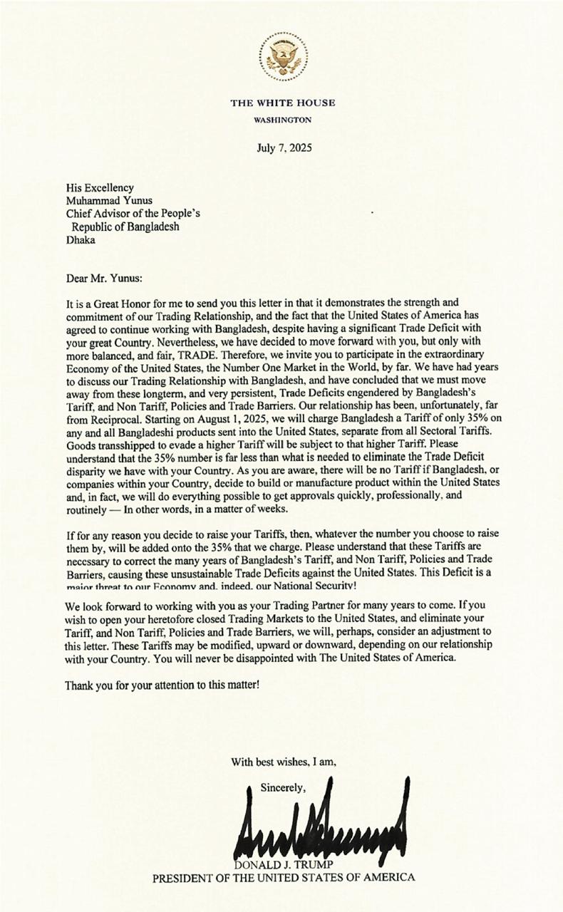 চিঠিতে বলা হয়েছে, বাংলাদেশের সঙ্গে যুক্তরাষ্ট্রের বাণিজ্য ঘাটতি বহু বছর ধরে চলমান এবং একপাক্ষিক। সেই ঘাটতি কাটাতে এ শুল্ক আরোপ করা হচ্ছে। কিন্তু সত্যটা হচ্ছে, বাংলাদেশ এখনো একটি উন্নয়নশীল ও উদীয়মান অর্থনীতি। আমরা অবকাঠামো, দক্ষতা ও উৎপাদন প্রযুক্তির দিক দিয়ে ভিয়েতনাম, চীন বা ভারত থেকে পিছিয়ে। ফলে আমাদের পক্ষে অতিরিক্ত শুল্কের বোঝা বহন করা কঠিন।