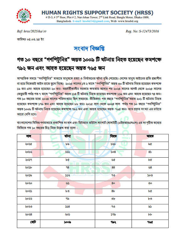 এইচআরএসএস বলছে, সম্প্রতি গণপিটুনির মাধ্যমে মানুষ হত্যা ও নির্যাতনের ঘটনা বেড়েছে। ডাকাত, চোর, ছিনতাইকারী সন্দেহেও গণপিটুনির ঘটনা ঘটেছে। এসবের বাইরে ধর্মীয় অবমাননা এবং ছেলেধরার অভিযোগেও গণপিটুনির ঘটনা ঘটছে। গণপিটুনির ঘটনায় থানায় মামলা হলেও সুষ্ঠু তদন্ত ও অপরাধীদের শাস্তি নিশ্চিতের ঘটনা খুবই কম। এসব ঘটনায় জড়িত ব্যক্তিরা আইনের আওতায় না আসায় এ ধরনের ঘটনা থামছে না।