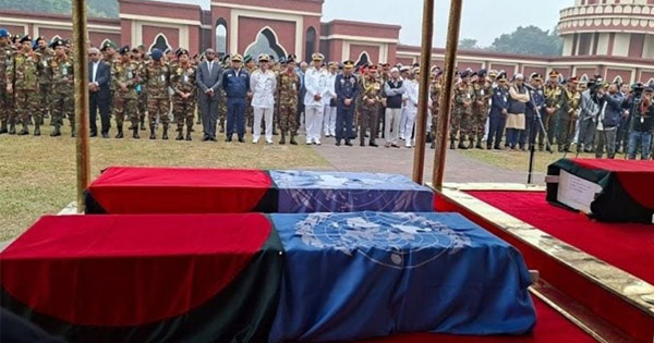রোববার (২১ ডিসেম্বর) সকাল সাড়ে ৯টার দিকে ঢাকা সেনানিবাসের কেন্দ্রীয় মসজিদে তাদের জানাজার নামাজ অনুষ্ঠিত হয়। জানাজা শেষে শহিদ শান্তিরক্ষীদের মরদেহে রাষ্ট্রপতি ও প্রধান উপদেষ্টার পক্ষ থেকে শ্রদ্ধা জানানো হয়।