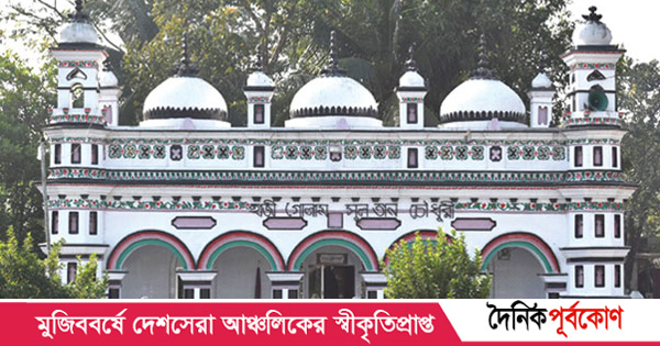 মসজিদটি নির্মাণে অসংখ্য বিদেশি মূল্যবান পাথর ব্যবহার করা হয়। মসজিদটি কারুকার্য খচিত নকশায় নির্মিত। সামনে পুকুর, খোলামেলা মাঠ থাকার দরুণ মসজিদটির সৌন্দর্য বহুলাংশেই বেড়ে গেছে। মসজিদের সামনের ফলক থেকে জানা গেছে ১৯২৮ সালে এটি নির্মিত হয়। এটির প্রতিষ্ঠাতা আমান আল্যাহ ভূঁইয়ার বংশধর বিশিষ্ট দানবীর শেখ হাজী গোলাম সুলতান চৌধুরী। মসজিদটির প্রতিষ্ঠাতা শেখ হাজী গোলাম সুলতান চৌধুরী এলাকার শিক্ষা ও অসংখ্য ধর্মীয় প্রতিষ্ঠান প্রতিষ্ঠার সঙ্গে যুক্ত ছিলেন। তাঁর জীবদ্দশায় তিনি মুসাফিরদের মসজিদভিত্তিক খাওয়ার ব্যবস্থা করতেন। এ মহান ব্যক্তি ১৯৫৪ সালে ইন্তেকাল করেন। তার নির্মিত মসজিদের পাশে তাঁকে সমাহিত করা হয়।