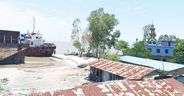 বেড়িবাঁধের বেশি অংশজুড়ে পাথরের ব্লক নেই। কিছু কিছু অংশে ভাঙ্গন ঠেকাতে জিও ব্যাগ ও টিউব দিয়ে ঝুঁকি এড়ানোর চেষ্টা করেছে পানি উন্নয়ন বোর্ড। মসজিদের অস্থায়ী বাঁধ ঘেঁষে জাহাজ আটকে যাওয়ায় সাগরের মোহনায় সৃষ্ট ঢেউ জাহাজের সাথে ধাক্কা লেগে ঘূর্ণায়মান স্রোত তৈরি করছে। এতে দ্রুতই সরে যাচ্ছে বেড়িবাঁধের গোড়ার মাটি। জোয়ারের সময় সাগরের ঢেউ এসে লাগছে মসজিদের দেয়ালের সাথে।