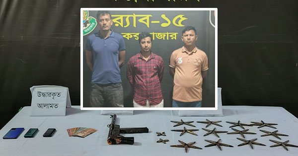 কক্সবাজারের দক্ষিণ কলাতলী এলাকা থেকে বিদেশি আগ্নেয়াস্ত্র ও গোলাবারুদসহ তিনজনকে গ্রেপ্তার করেছে র্যাব-১৫। এর ম্যধ দিয়ে রোহিঙ্গা ক্যাম্প থেকে কক্সবাজার ও মহেশখালী পর্যন্ত বিস্তৃত একটি অবৈধ অস্ত্র সরবরাহ চক্রের কার্যক্রম উন্মোচিত হয়েছে বলে জানিয়েছে র্যাব।