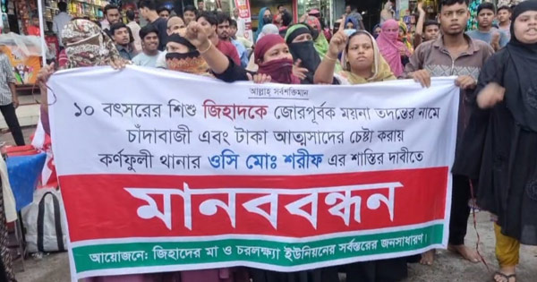 মঙ্গলবার (২৯ জুলাই) বিকেল সাড়ে ৫টায় কর্ণফুলী উপজেলার মইজ্জারটেক মোড়ে বিক্ষোভ ও মানববন্ধনে অংশ নিয়ে ভুক্তভোগী পরিবার ও এলাকাবাসী কর্ণফুলী থানার ভারপ্রাপ্ত কর্মকর্তা (ওসি) মুহাম্মদ শরীফের শাস্তির দাবি জানান।